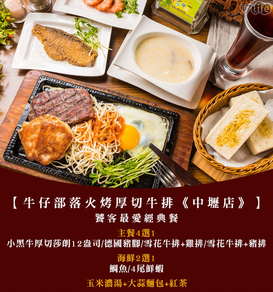 豪華排餐盛宴,當個牛仔大王 ![]() 饕客最愛經典餐 ![]() 主餐4選1 小黑牛厚切莎朗12盎司 嚴選小黑牛莎朗厚切,柔嫩多汁、筋肉些許,多了點咀嚼的口感,層次更為豐富。 ![]() ![]() 德國豬腳 為牛仔部落的鎮店招牌菜,外皮口感Q彈,裡面肉質鮮美軟嫩,不膩口的大塊德國豬腳,期待您來大飽口福。 ![]() ![]() 嚴選優質雪花牛,厚實Size,一刀切下,有著漂亮的粉色剖面!烤得剛好的熟度,不乾老不過生,佐以鹽巴入口品嚐,鮮嫩的口感和濃郁牛肉香在嘴裡擴散,美味令人陶醉!再搭配雞排或豬排,一次享受不同滋味。 雪花牛排+雞排 ![]() 雪花牛排+豬排 ![]() 除了排餐外再搭配新鮮海味,海陸雙全滋味更佳!香煎鯛魚、香烤鮮蝦任你選,鮮甜細緻難以抗拒。 ![]() 鯛魚 ![]() 4尾鮮蝦 ![]() 不僅只有排餐,還有豐盛的湯品、麵包與飲品,完整的饗宴時刻。 玉米濃湯 ![]() 大蒜麵包 ![]() 紅茶 ![]() 【牛仔部落火烤厚切牛排《中壢店》】 西部牛仔的異國風情都在【牛仔部落火烤厚切牛排】!以牛仔的粗曠狂野風格裝飾,讓整個空間顯得大氣而舒適,搭配多種牛仔單品,彷彿置身於牛仔部落! ![]() ![]() ![]() ![]() |