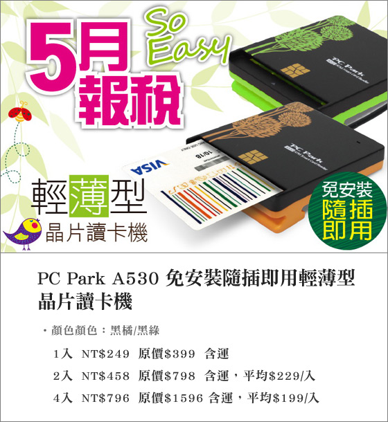 PAUL一向是個理性的消費者,能讓他讚賞的商品不多了!走過路過,千萬不要錯過!請參閱詳細商品資訊PC Park A530 免安裝隨插即用輕薄型晶片讀卡機最近我也在找PC Park A530 免安裝隨插即用輕薄型晶片讀卡機的相關資訊~整理了GOOGLE上關於PC Park A530 免安裝隨插即用輕薄型晶片讀卡機搜尋前幾名排序的資料來輔助!PAUL最近也對這個商品很感興趣, |  | PC Park A530 免安裝隨插即用輕薄型晶片讀卡機-網路報稅免出門,隨插即用晶片讀卡機,支援多種卡片轉帳/繳費/查詢,免安裝驅動,超薄易攜好收納!平均每入最低只要199元起(含運)即可購得PC 售價:199