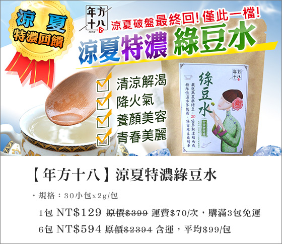 | 年方十八-涼夏特濃綠豆水-涼夏破盤最終回,體感41度大熱天,網友激推討論超解渴, 20倍萃取濃縮特濃綠豆水,健康低熱量不含糖!平均每包最低只要99元起(3包免運)即可購得【年方十八】涼夏特濃綠豆水1包 售價:99