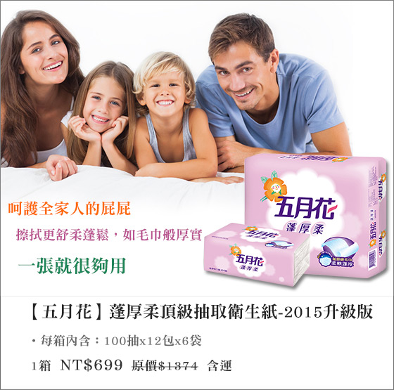 五月花-蓬厚柔頂級抽取衛生紙-2015升級版也有些網路上部落客的評價也值得我們參考.網路價格隨時會調整,請以原網購平台資料為準!一直以來我都很相信Yves推荐的東西。還有去各大拍賣網站RUTEN露天、YAHOO拍賣收集商品資料!到實際到銷售的EC去看,價格就有機會再便宜一些! |  | 五月花-蓬厚柔頂級抽取衛生紙-2015升級版-擦拭柔感一包不到$10,【五月花】革命新體驗!如毛巾般的柔軟舒適,超強韌吸水性,呵護全家人的日用生活只要699元(含運)即可購得【五月花】原價1374元蓬 售價:699
