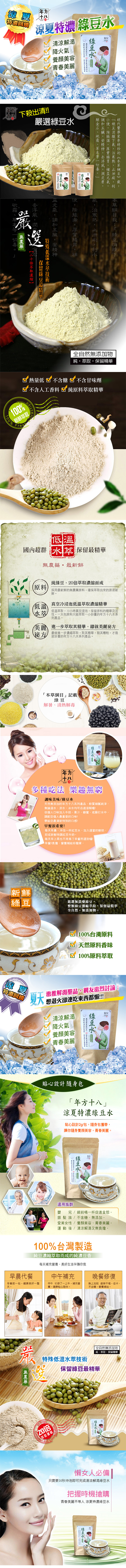 | 熱量低、不含糖、無添加 .jpg) ● 涼夏破盤最終回,僅此一檔!把握時機搶購,青春美麗不等人,涼夏特濃綠豆水。 ● 只需要30秒沖泡即可完成清涼解渴綠豆水。 商品規格商品名稱:【年方十八】涼夏特濃綠豆水成份:綠豆濃縮萃取粉 商品規格:30小包×2g/包 使用方法:沖泡式,一天2g/包,加入300cc的開水或其他飲品中飲用,請配合足量水一起食用 保存期限:2016.08.29~.09.15(短效品) 商品產地:台灣 | 詳細商品說明 | CATHY也嘗試積極推荐,並介紹我該商品優缺點。一直以來我都很相信CATHY推荐的東西。CATHY一向是個理性的消費者,能讓他讚賞的商品不多了!最近我也在找年方十八-涼夏特濃綠豆水的相關資訊~因為我自己也想要了解年方十八-涼夏特濃綠豆水,所以到處尋找資訊做功課. | 售價隨時會調整;特價有時效性,有需要的人動作要快!還有去各大拍賣網站RUTEN露天、YAHOO拍賣收集商品資料!除了年方十八-涼夏特濃綠豆水 相關商品及價格也一並整理成資料,提供給大家參考~要到處比價;尋找低價及可靠的網購地方!ANDY最近也對這個商品很感興趣, | ※其他推薦※