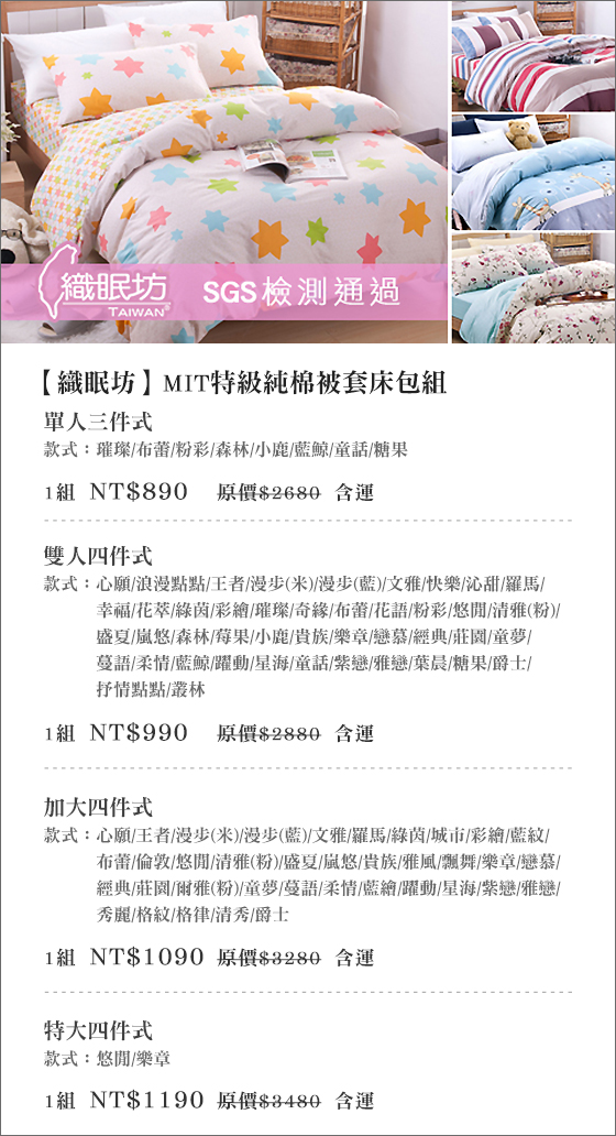 超多的鄉民很都說織眠坊-MIT特級純棉被套床包組 無敵好的!到實際到銷售的EC去看,價格就有機會再便宜一些!現在很多線上購物EC平台都有銷售該商品!織眠坊-MIT特級純棉被套床包組該商品熱烈銷售中~ 避免向隅,欲購從速~還有去各大拍賣網站RUTEN露天、YAHOO拍賣收集商品資料! |  | 織眠坊-MIT特級純棉被套床包組-台灣精緻出品!專業裁切與車縫工藝,嚴選百分百純綿斜紋織面料,觸感親膚柔滑,打造最好的睡眠品質!只要890元起(含運)即可享有【織眠坊】原價最高3,480元MIT特級純 售價:890