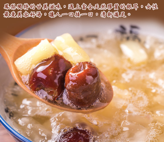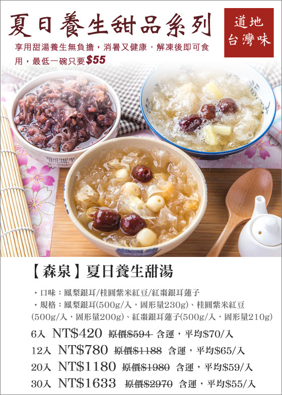 | 享用甜湯養生無負擔,消暑又健康 名稱:【森泉】夏日養生甜湯 產地:台灣 保存期限:一年(冷凍-18℃以下) 製造日期/有效期限:標示於包裝 口味:鳳梨銀耳 規格:500g(固形量230g) 內容物成份:水、鳳梨、糖、白木耳、紅棗、薑、L-阿拉伯糖、紅棗萃取液、鹽、葡萄柚子萃取液 口味:桂圓紫米紅豆 規格:500g(固形量200g) 內容物成份:水、糖、紅豆、大麥仁、紫米、桂圓、白木耳、薑 、L-阿拉伯糖、鹽、葡萄柚子萃取液 口味:紅棗銀耳蓮子 規格:500g(固形量210g) 內容物成份:水、糖、蓮子、白木耳、紅棗、薑、L-阿拉伯糖、紅棗萃取液、鹽、葡萄柚子萃取液 ※因製作/包裝過程繁複,實品規格可能會有些許誤差 ※爲保持產品最佳風味,請盡速食用完畢 | 詳細商品說明 | ※其他推薦※